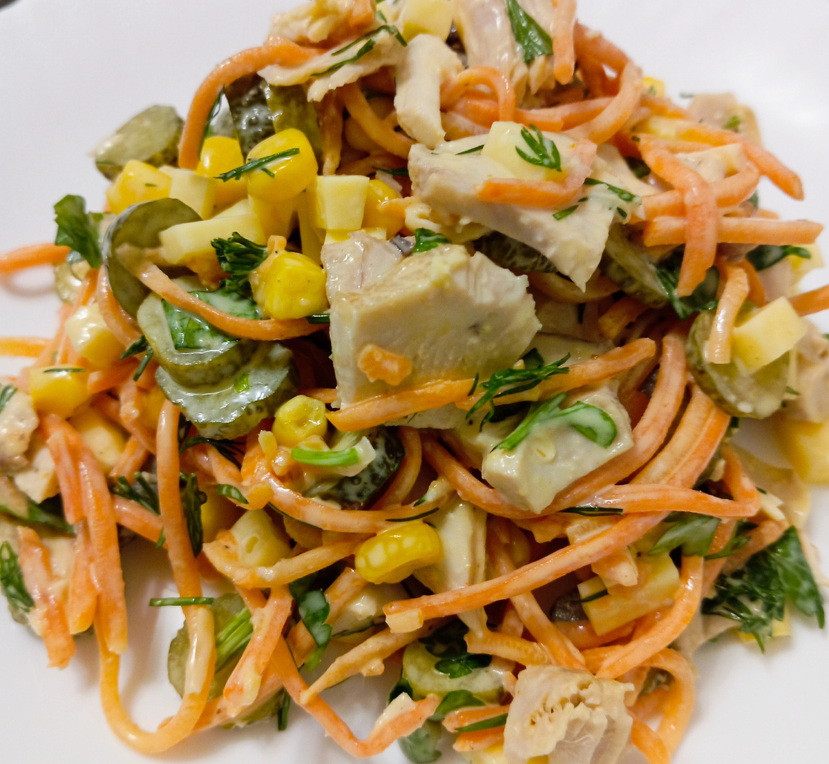 Салат "Мечта" с куриной грудкой, корнишонами и морковью по-корейски.