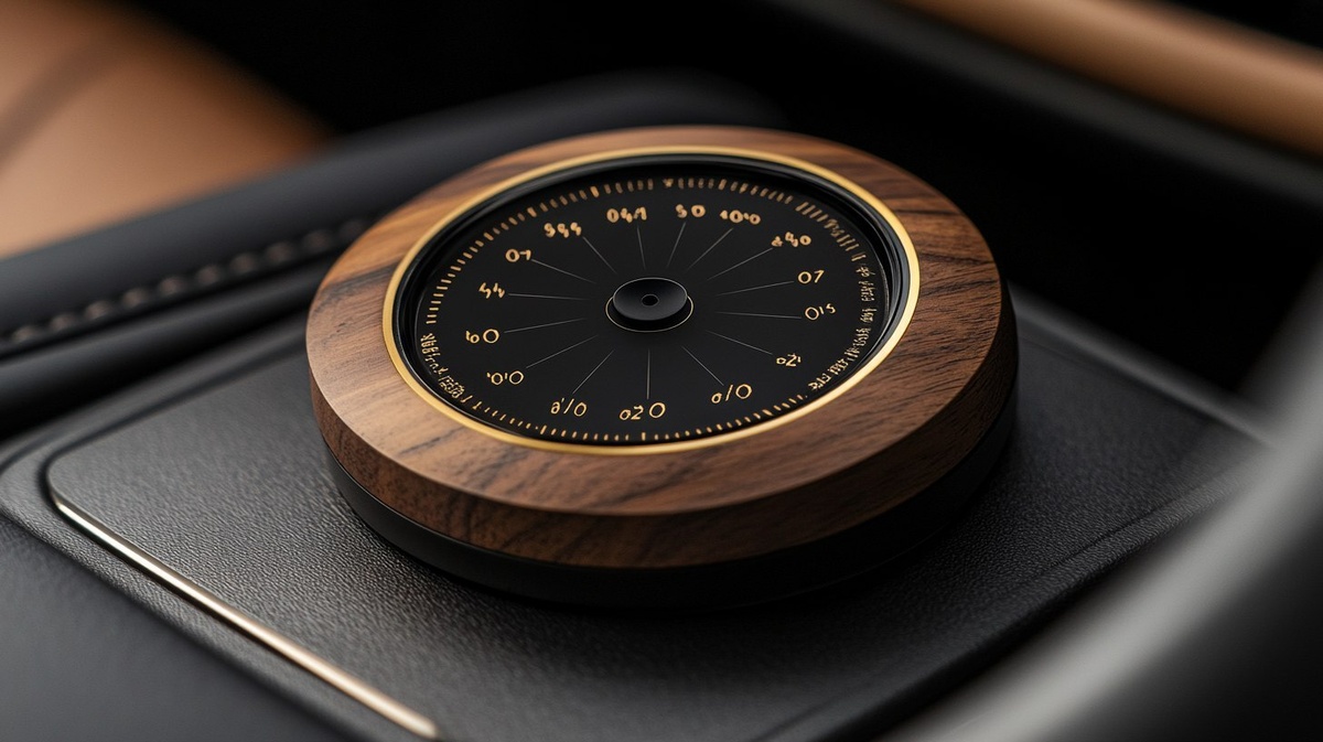 Создано на основе запроса: A low-profile, premium car phone number display device with a circular walnut wood dial and engraved numbers