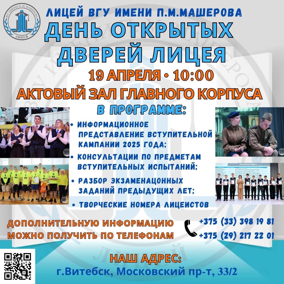 👋День открытых дверей в Лицее ВГУ ➡️19-го апреля в 10:00 для всех желающих гостеприимно распахнет свои двери Лицей ВГУ имени П.М. Машерова. Мероприятие пройдет в актовом зале главного корпуса Витебского государственного университета имени П.М. Машерова. 🔵Вы сможете узнать актуальную информацию о подготовке к экзаменам и вступительной кампании 2025/2026 учебного года, получить консультации по предметам вступительных испытаний, задать все интересующие вопросы, познакомиться с педагогами, пообщаться с лицеистами и получить удовольствие от творческих номеров учащихся. #анонсы #абитуриенту