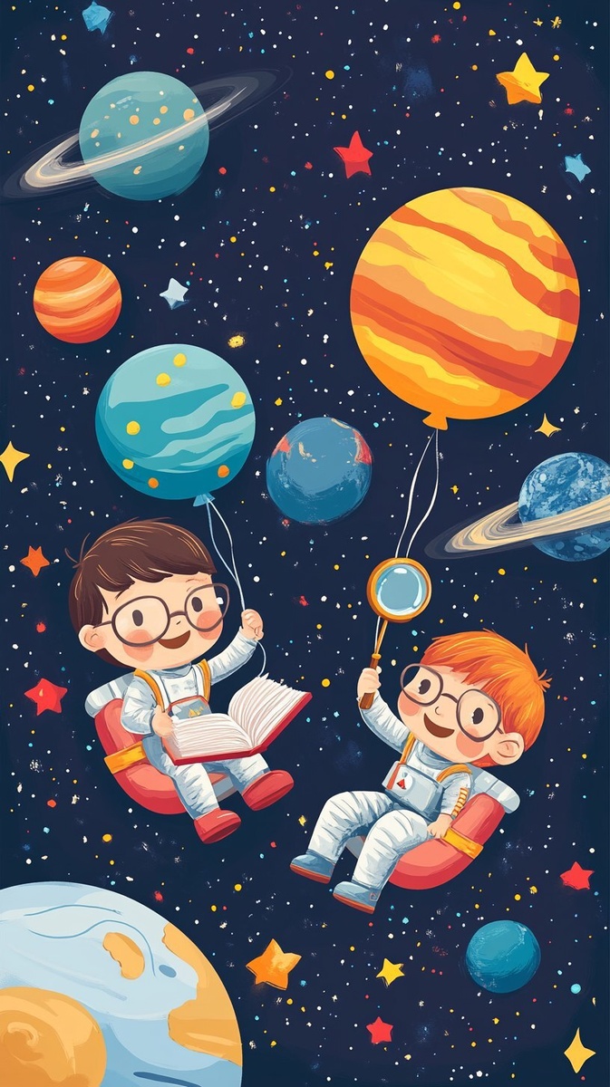 Создано на основе запроса: a cartoon outer space background with kids wearing space suits, flying with balloons among planets and stars