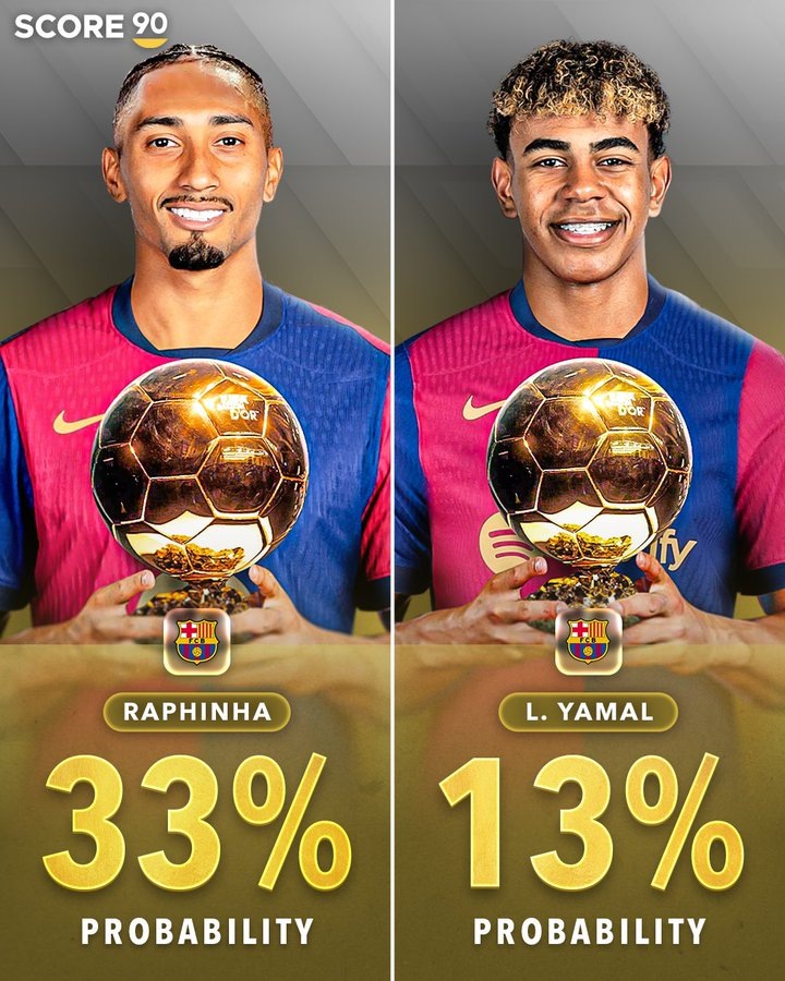 По данным букмекеров, два главных фаворита на победу в «Золотом мяче» 2025 года — игроки «Барселоны». Ламин Ямаль уже выбил 14+17 голевых действий и оценивается вторым претендентом с вероятностью 13%. Рафинью не догнать: 28 голов и 29 ассистов, закономерные 33% шанса на «ЗМ». Последний раз два футболиста «Барсы» всерьез претендовали на награду в 2019 году, когда Лионель Месси выиграл трофей, а Антуан Гризманн занял третье место. Ранее подобное случалось в 2015 году (Месси и Неймар) и 2010-м (Месси и Хави). А в 2012-м игроки «Барсы» заняли оба первых места, тогда к Месси приблизился Андрес Иньеста.