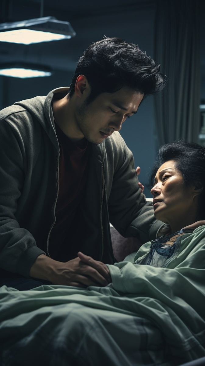 Создано на основе запроса: emotional reunion, man kneeling by hospital bed, holding his mother’s weak hand, tearful goodbye, soft ambient