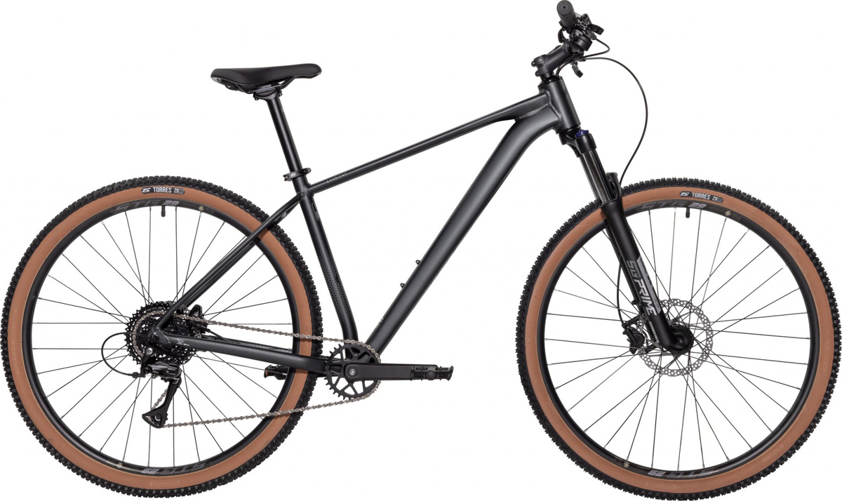 Внешне Stinger Gradient STD 29 (2025) выглядит строго и современно. В представленной на фото расцветке – матовом графитовом – велосипед производит сдержанное, но очень цельное впечатление. Цвет не перетягивает на себя внимание, зато подчёркивает форму рамы и аккуратную прокладку тросов. Вилка, руль и прочие компоненты подобраны в тон, создавая ощущение визуального единства, а покрышки с коричневыми боковинами добавляют характерный акцент, перекликаясь с более дорогими моделями бренда.