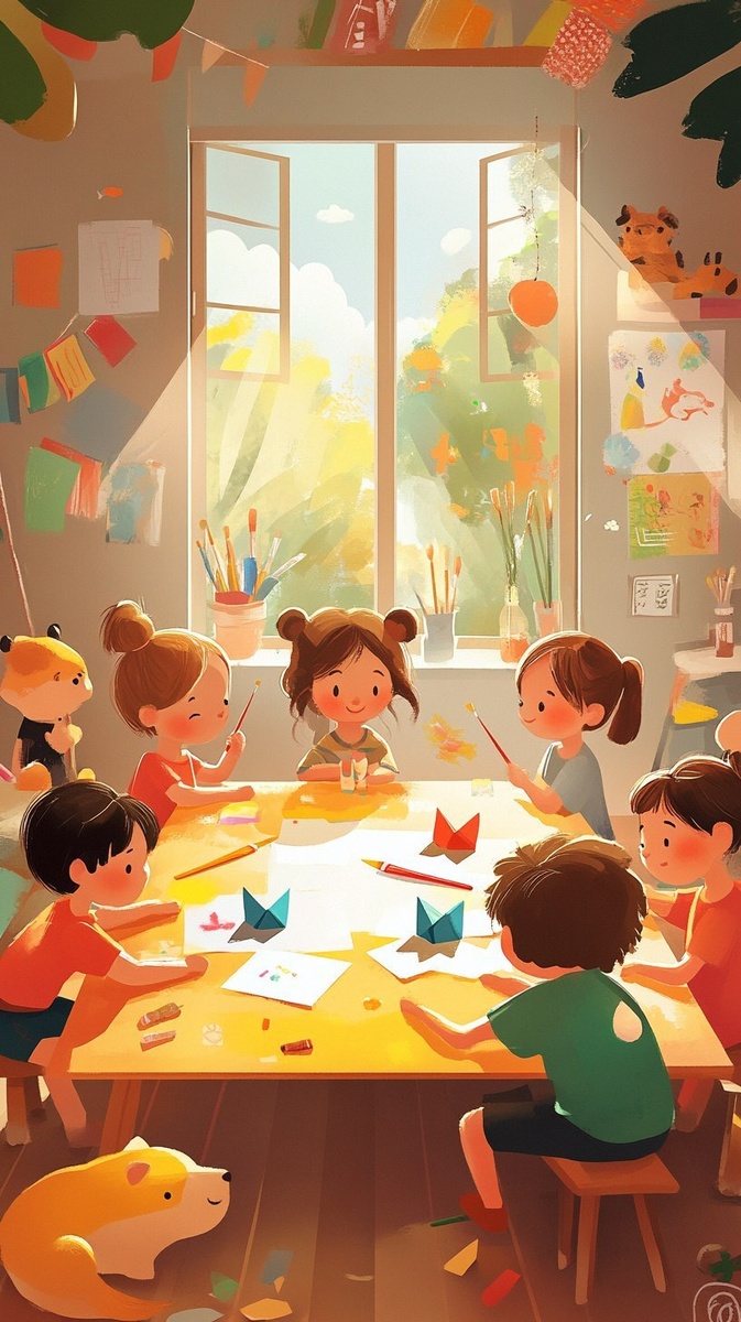 Создано на основе запроса: a playful cartoon room filled with kids painting, folding origami, and making crafts, warm colors, cute