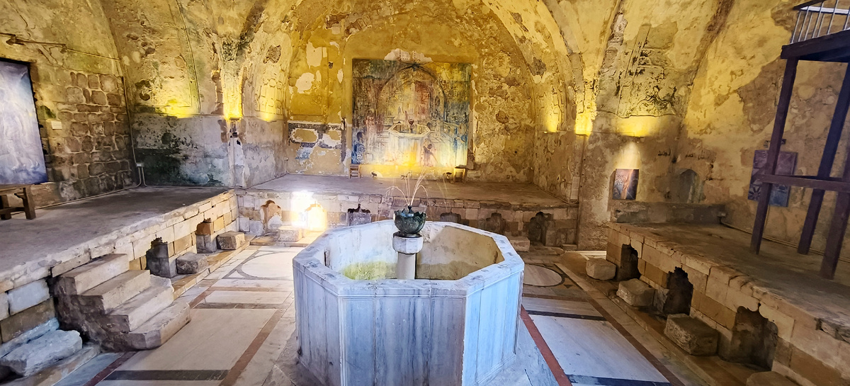 Я уже несколько раз тут рассказывала о картинах моего знакомого. Он художник из Англии, его зовут Том Янг. Том живет в Бейруте прямо напротив порта. В 2020 году он чудом не попал под раздачу при детонации селитры. Квартира была повреждена, некоторые картины тоже пострадали. Выжил, но досмер ти перепугался домашний кот. А вот Том с женой были в этот момент в Сайде. Потому что готовили к выставке то место, о котором ниже и пойдет речь. Выставка, возможно, спасла их обоих. Выставку устроили в старом хаммаме. Это самый большой хаммам средневековой Сайды. В нем большой общий зал с фонтаном и огромное количество помывочных, коридоров и т.п. Прям, целый лабиринт. Хаммам почти 50 лет был заброшен. Его, как смогли, очистили. Я как раз была свидетелем этих работ: мы шли с туристами по привычному мне маршруту и внезапно увидели, что дверь в вечно закрытое помещение приоткрыта. Конечно, просочились внутрь. И нам все показали. Это было начало работ. Том намеренно устраивает выставки в такого рода