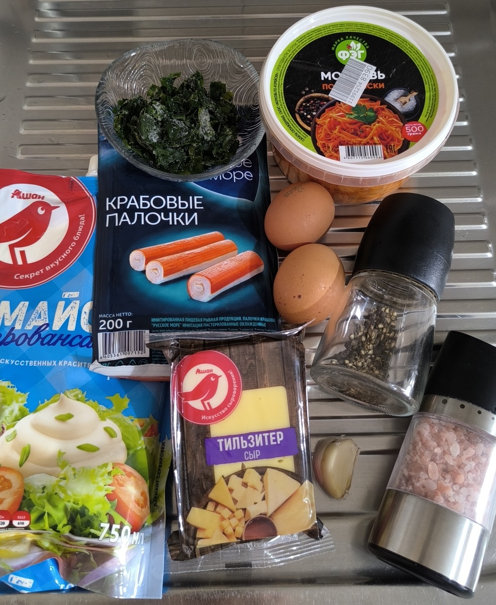 В миске соединить морковь, крабовые палочки, сыр, яйца и зелень.