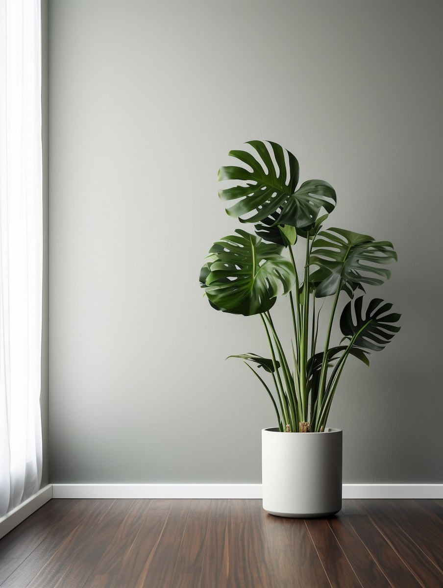 Создано на основе запроса: Modern minimalistic apartment interior. Camera positioned lower to show more of the dark wooden floor (rich walnut or espresso tone), taking up at least the lower half of the image. Large green plant (monstera or palm) in the front left corner, partially visible, with soft blur for depth. Background wall is a contrasting light gray or neutral cool tone, with gentle natural shadows and clean texture. No furniture, no product only interior elements. Lighting is soft and daylight-like. Composition leaves ample central space for placing a beige pedestal fan prominently. Stylized realism or digital illustration, clean and elegant. --- Автоперевод: Современный минималистичный интерьер квартиры. Необычно получилось? 🤔 https://dzen.ru/id/65c0c65c86e4f837c27b24d7 #ИИ #AI #нейросеть #midjourney #art
