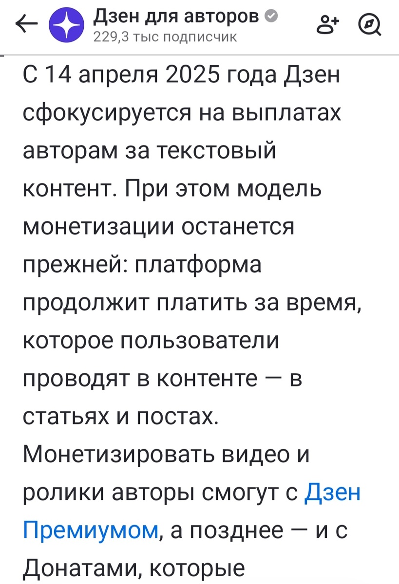 Именно так я начинала каждое своё видео. Теперь же я в растерянности. С сегодняшнего дня Дзен прекратил монетизировать видео-ролики и будет платить только за текстовой формат контента. Прилагаю скриншоты из статьи Дзена.