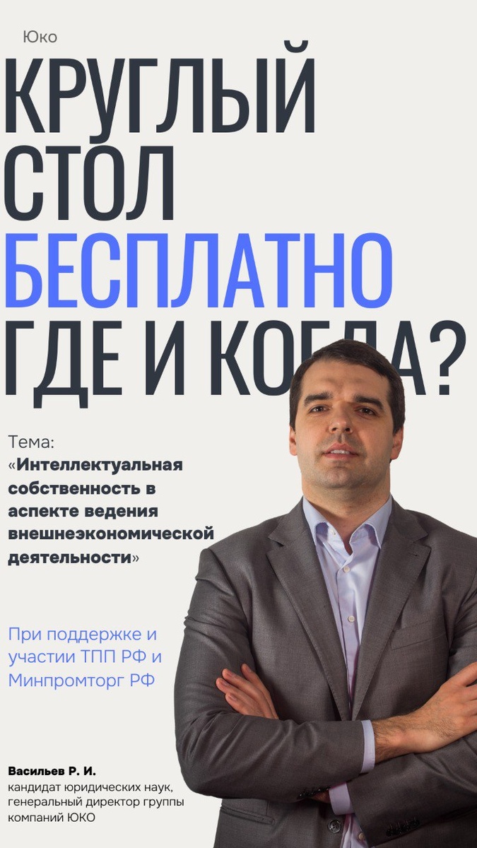 ⚡️❗️❗️❗️❗️ Круглый стол в формате оффлайн! Тема: «Интеллектуальная собственность в аспекте ведения внешнеэкономической деятельности» Место проведения: Малый зал ТПП России, ул. Ильинка, д.6 Дата: 22 апреля 2025 (14:00-16:00) Условия участия: Бесплатно, при условии предварительной регистрации. Подробная информация по основным направлениям дискуссии, приглашенным спикерам, а также ссылка для регистрации: https://just-skills.ru/circle_table P.S. Среди приглашенных спикеров, Чекушов Р. А. - зам. министра Минпромторг РФ; Васильев Р. И. - генеральный директор ООО "ЮКО". #круглый_стол #ВЭД #НИОКР