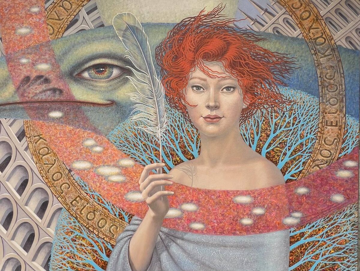 Калейдоскоп 65х85 холст/акрил 2024 ••• Работа «Калейдоскоп» погружает зрителя в обрывочные впечатления, стеклянные осколки, оставшиеся от какого-то загадочного опыта. Округлые линии, проходящие через все полотно, стягивают действительно калейдоскопическое движение воедино. Однако в центре этого движения находится женская фигура. Не портрет конкретного человека или, наоборот, лишенный конкретики типаж, а образ одновременно и индивидуальный и типичный. Скрывающаяся от первого взгляда надпись на греческом καλός εἶδος, указывает как на источник слова калейдоскоп, так и на то, что в действительности изображено на картине: прекрасный образ. ••• Поиграть в визуальную игру и разгадать сюрреалистические метафоры художницы можно на выставке Елены Косаревой «Не несуществующие звери» до 10 мая. ••• Москва. Ходынский бульвар 20а, с 11:00 до 21:00 ежедневно. Выставка бесплатная, работы продаются. Вся контактная информация на сайте YOLKA.