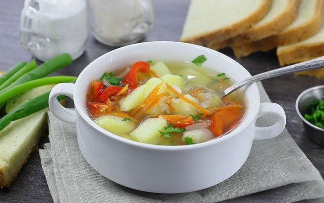 Овощной суп с рисом и корейской морковью🥄 Оригинальное первое блюдо с пикантным вкусом благодаря ароматной моркови по-корейски. Готовится суп на воде без использования мясных продуктов и масла. Картофель и рис делают суп сытнее, а сладкий перец и зелень – ярким и ароматным. 🍃🍃🍃🍃🍃 (на 6 порций) • Картофель - 250 г • Морковь по-корейски - 100 г • Перец сладкий - 100 г • Лук репчатый - 100 г • Рис - 50 г • Соль - по вкусу • Перец чёрный молотый - по вкусу • Зелень свежая - 10 г • Вода - 1,5 л 🍃🍃🍃🍃🍃🍃🍃🍃 • Морковь по-корейски можно купить или использовать приготовленную в домашних условиях. • В кастрюле доведите до кипения 1,5 л воды. • Картофель очистите и промойте. Нарежьте кубиками небольшого размера и опустите в кипящую воду. • Лук очистите и промойте. Нарежьте средними кубиками или четвертинками колец. Отправьте следом за картофелем. • Рис промойте, несколько раз меняя воду, до прозрачности воды. Добавьте в кастрюлю и перемешайте. Доведите до кипения. Варите на небольшом