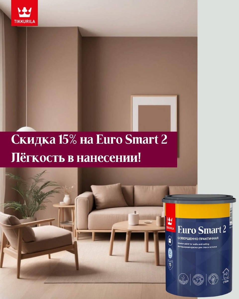 Готовы обновить цвет стен? 😏 Обратите внимание на краску Euro Smart 2! Если вам важна легкость в нанесении и отсутствие разбрызгиваний, эта краска – идеальный выбор! 💪Euro Smart 2 отлично подходит как для опытных маляров, так и для тех, кто только начинает свой путь в покраске. Она быстро сохнет и образует гладкую поверхность с отличными декоративными свойствами, что позволит вам получить идеально ровный и стильный результат😇 Кроме того, Euro Smart 2 можно колеровать в любые светлые оттенки из коллекции Tikkurila Symphony ✨, создавая именно тот цвет, который идеально впишется в ваш интерьер! 🎉 До конца апреля на эту краску будет действовать скидка 15% 📍 Подробнее об акции читайте на нашем сайте и приходите в Студии Цвета Tikkurila за качественными материалами💌 #EuroSmart2 #СтудияЦветаTikkurila #стойкаякраска #влагостойкаякраска #трендыдизайна