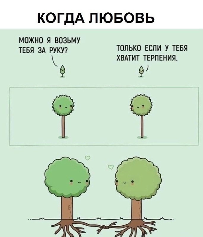 Настоящая близость не торопится На изображении — два деревца. Одно спрашивает: «Можно я возьму тебя за руку?» Другое отвечает: «Только если у тебя хватит терпения». В последнем кадре они — уже взрослые деревья, и их корни переплетены. Это трогательная метафора любви, которая не случается мгновенно. Она требует времени, выдержки и готовности расти рядом. Настоящая близость формируется не за день — корни должны укрепиться, пробиться сквозь страхи, обиды и ожидания. Проблема в том, что мы часто хотим сразу: внимания, взаимности, идеальной связи. Но если торопить рост — можно сломать. Если ждать — можно построить то, что действительно глубоко и живо. Любовь — это не вспышка. Это процесс. Это терпение. Это рост. Если вы устали ждать или не верите, что любовь возможна без боли — поговорите с психологом. Мы вместе найдём путь к зрелым отношениям.