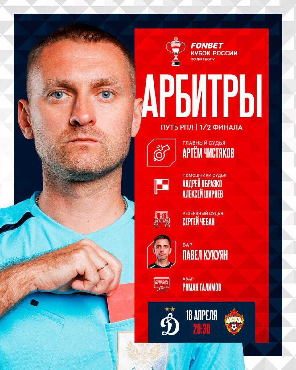 Артем Чистяков назначен главным арбитром ответного матча 1/2 пути РПЛ кубка #ДинамоЦСКА Судья VAR — Павел Кукуян. Матч покажут по бесплатному каналу Матч ТВ. Комментаторы будут известны позже. Встреча начнется в 20:30. Подписывайтесь на БуДсу!