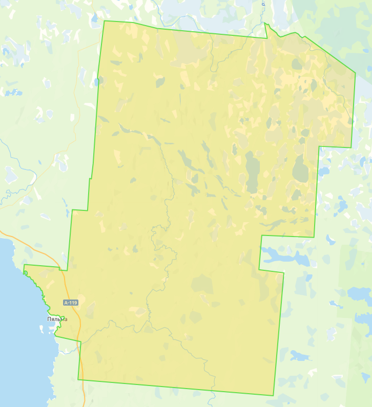 Участок 1 Северная граница - по границе Пудожского района, далее по границе Республики Карелия в точке с координатами 62.748595 N, 36.661033 E Восточная граница - от точки с координатами 62.748595 N, 36.661033 E на юг до точки с координатами 62.655698 N, 36.647300 E, далее на запад до точки с координатами 62.658221 N, 36.563358 E, далее на юг до точки с координатами 62.540036 N, 36.549453 E, далее на запад до точки с координатами 62.541460 N, 36.413326 E, далее на юг до точки с координатами 62.501382 N, 36.407661 E, далее на восток до точки с координатами 62.495833 N, 36.472892 E, далее на юг до точки с координатами 62.347059 N, 36.443710 E Южная граница - от точки с координатами 62.347059 N, 36.443710 E, на запад до точки с координатами 62.367767 N, 35.915336 E Западная граница - от точки с координатами 62.367767 N, 35.915336 E на север до точки с координатами 62.418359 N, 35.922203 E, далее на запад до берега Онежского озера, далее по берегу Онежского озера, далее по границе Пудожско