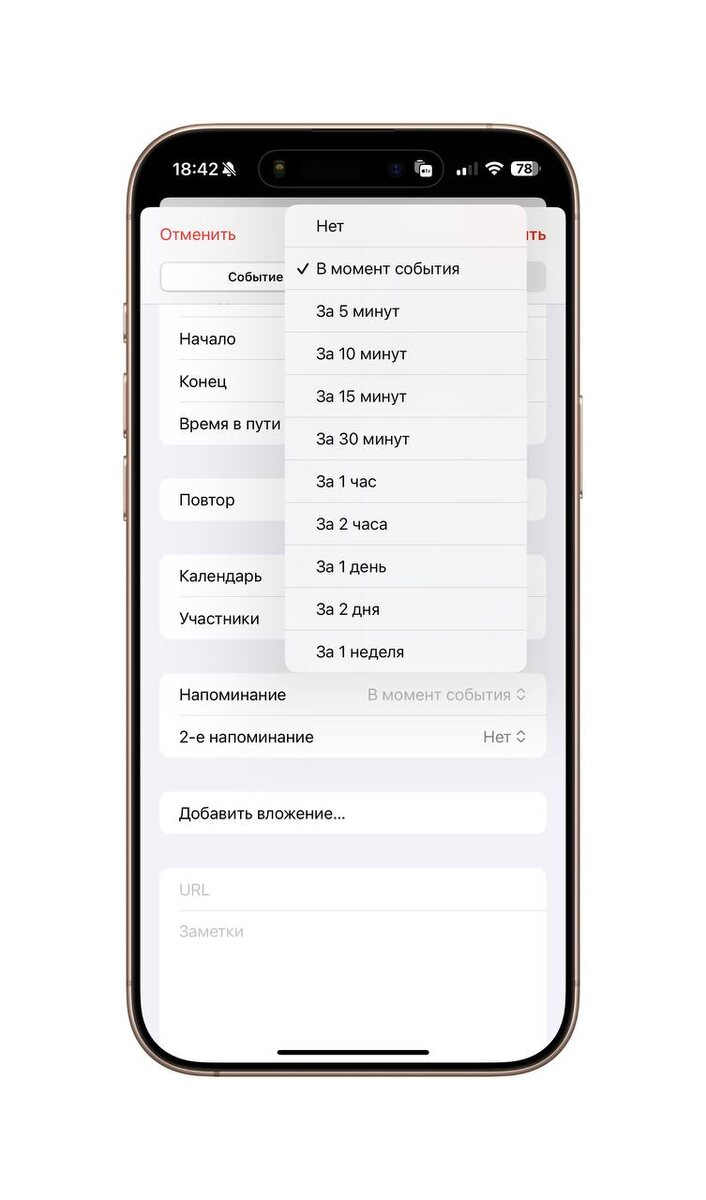 Но настроить уведомление на конкретный день можно через «Календарь». Создайте событие и в разделе «напоминание» выберите «в момент события».