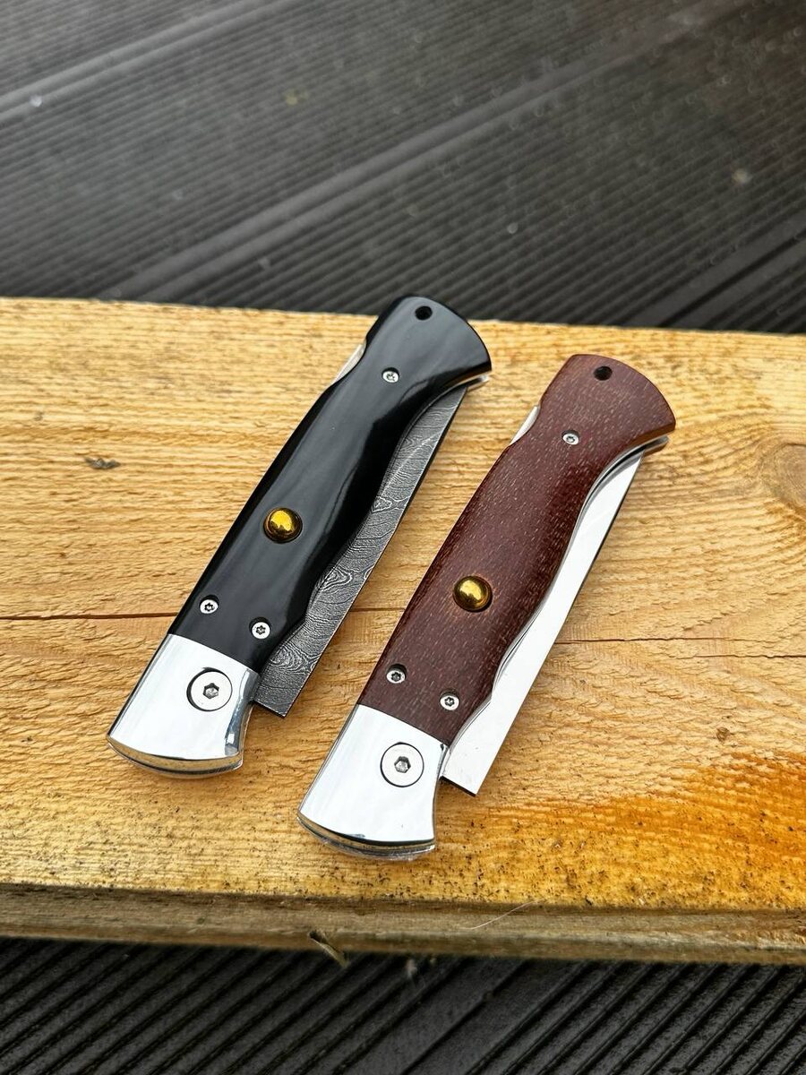 Два выкидных ножа «Волк». Первый выполнен из дамасской стали в 950 слоев. Накладки на ноже выполнены из акрила черного. Замок: Back-lock. Твердость клинка (HRC): 62 Цена за нож со скидкой: 14.560 рублей. Второй складной нож из отечественной стали х12мф с крио. Накладки на ноже выполнены из текстолита. Замок на ноже: Back-lock. Твердость клинка (HRC): 61-62 Цена за нож: 14.000 рублей. В комплекте идут ножны из натуральной кожи. Для заказа писать на @Nazarklinokbot или по тел +79101343831 WhatsApp/Viber