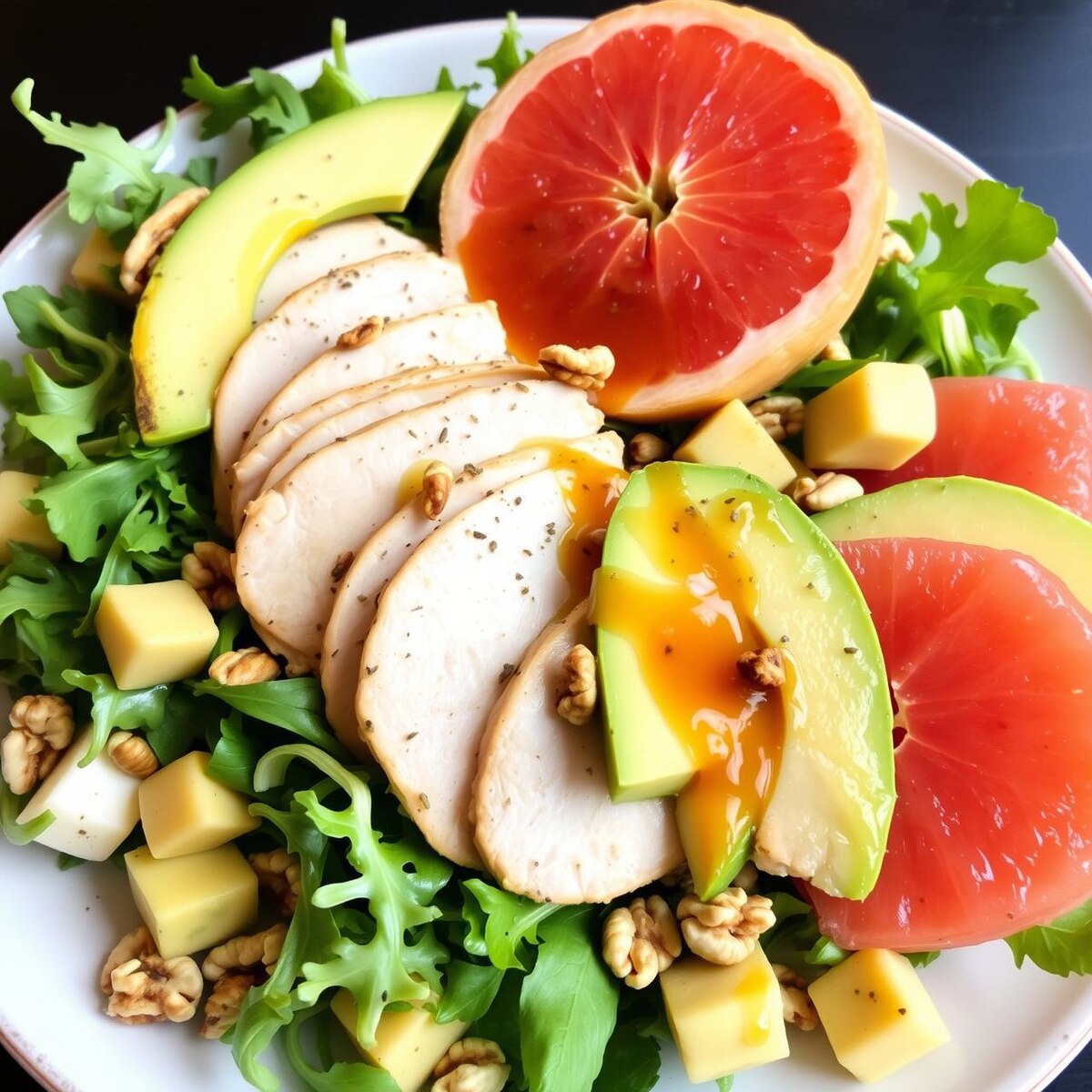 Я обожаю этот салат за игру контрастов. Сочное куриное филе с лёгким ароматом специй. Кремовый авокадо, как нежная подушка вкуса. И яркий, бодрящий грейпфрут, который взрывается во рту и говорит: «Проснись! Живи!» Добавим немного рукколы для пряности, орешков для хруста и простой, но выразительный цитрусовый соус. Всё. Это гастрономическая поэзия в одной тарелке.