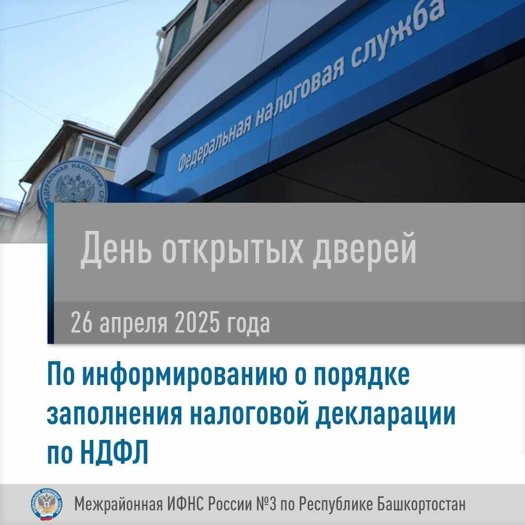 До окончания срока представления деклараций осталось меньше месяца ФНС России напоминает о том, что: 30 апреля 2025 года СРОК ПОДАЧИ декларации о доходах по форме 3-НДФЛ за 2024 год 15 июля 2025 года СРОК УПЛАТЫ налога на доходы физических лиц, исчисленного в декларации В целях информирования граждан о налоговом законодательстве и порядке заполнения налоговых деклараций по налогу на доходы физических лиц будет проведен День открытых дверей 26 апреля 2025 года с 10.00 до 17.00 часов по адресам: г. Стерлитамак, пр. Октября, 34 г. Сибай, ул. Маяковского, 31/1 с. Акъяр, пр. С.Юлаева, 20/1 Основные задачи Дня открытых дверей: Телефон «горячей линии» 8 (347) 215-10-70, доб. номер 55-55. Источник: ФНС России.