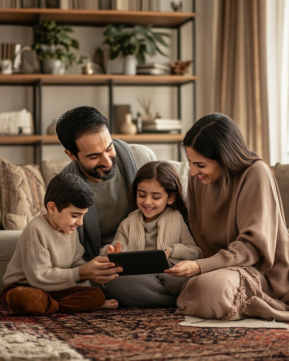 Создано на основе запроса: modern realistic family scene, Iranian father and mother watching their two children (ages 4-6) learning Persian