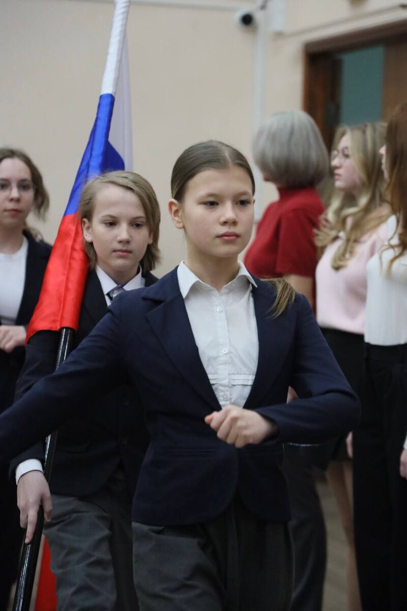 1️⃣ Знаменосцы первого корпуса — Кира, Роман, Евгения и Анастасия из 6 «Б».