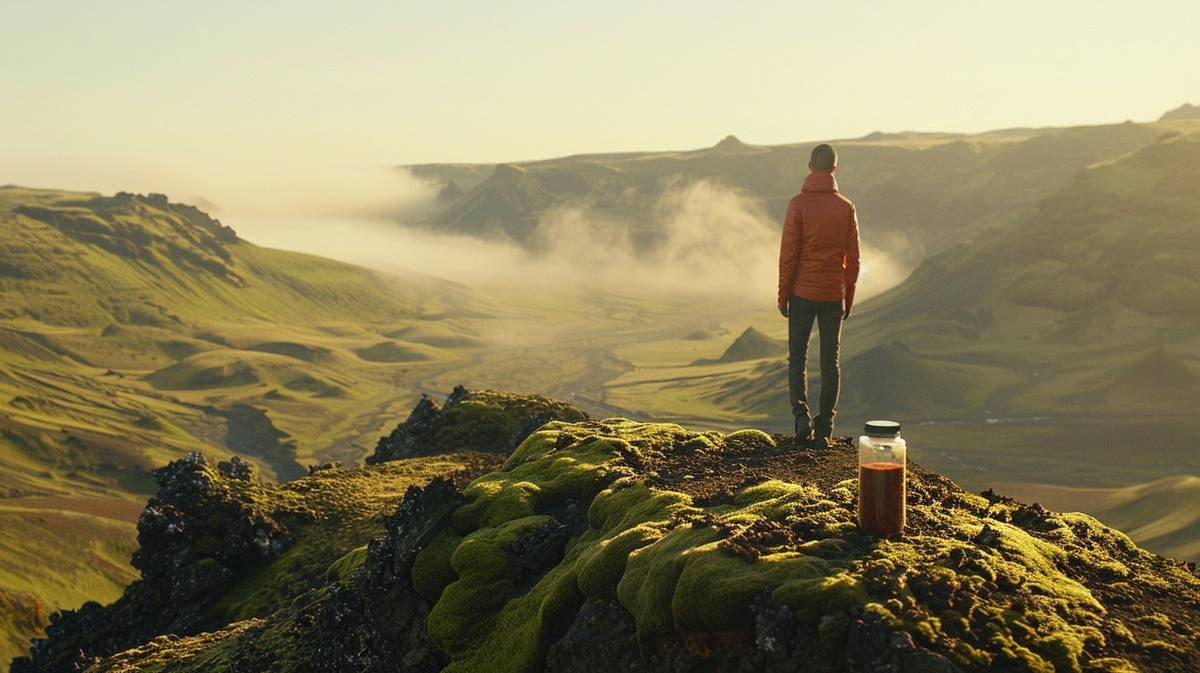 Создано на основе запроса: A man in his 30s or 40s standing on a mountain ridge at sunrise, arms slightly open, breathing deeply, facing a vast green valley. The scene radiates vitality, renewal, and grounded energy. Natural warm lighting, soft mist in the distance. In the foreground, on a mossy rock or wooden stump, a small glass jar with a black lid (shilajit jar), subtly placed and out of focus. The focus is on the person and the feeling of inner strength and reconnection. No text, cinematic, photorealistic --- Автоперевод: Человек в возрасте 30 или 40 лет, стоящий на горном хребте на рассвете, слегка открытые руки, глубоко дышат глубоким, обращенным к огромной зеленой долине. Классно вышло? 🤔 https://dzen.ru/id/65c0c65c86e4f837c27b24d7 #ИИ #AI #нейросеть #midjourney #art