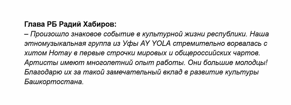 Указом Главы Республики Башкортостан Радия Хабирова музыкантам группы Ay Yola, авторам песни Homay, присвоены почётные звания. О присвоении почетных званий руководитель региона рассказал на оперативном совещании Правительства РБ в ЦУРе. За высокие творческие достижения: - Ринат Рамазанов удостоен звания «Народный артист РБ», - Руслан и Адель Шайхитдиновы удостоены званий «Заслуженный артист РБ». Подробности по ссылке