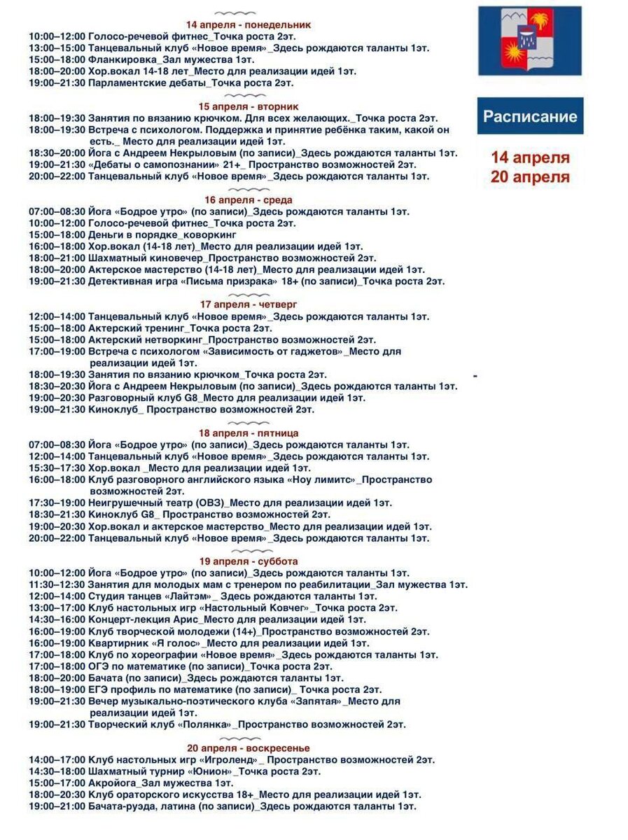 Расписание мероприятий в Доме Молодёжи с 14 по 20 апреля 💸Вход бесплатный 📍 ул.Навагинская, 9