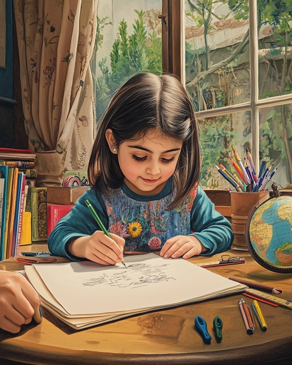 Создано на основе запроса: a bright, modern classroom corner in a cozy home, a 6-year-old Iranian child drawing famous Iranian poet on a paper, surrounded by craft supplies, globe, and books in Persian, parental hands nearby offering support, inspirational and educational, photorealistic --- Автоперевод: Яркий, современный уголок в классе в уютном доме, 6-летний иранский ребенок, рисующий знаменитого иранского поэта на бумаге, окруженный ремесленными принадлежностями, глобусом и книгами в персидских руках, близких, предлагая поддержку, вдохновляющую и образовательную, фотореалистичную Как тебе такая генерация? 🤔 https://dzen.ru/id/65c0c65c86e4f837c27b24d7 #ИИ #AI #нейросеть #midjourney #art