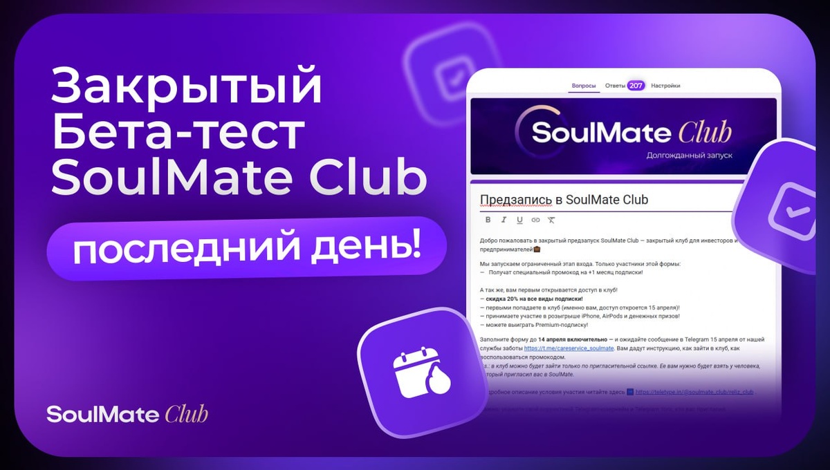 Сегодня последний день предзаписи в SoulMate Club🔥 ⏳ До 23:59 (МСК) — и всё, двери закроются. С момента запуска формы предзаписи, мы уже получили 207 заявок — мы искренне благодарны каждому, кто уже заполнил форму🤝 Вы — наши первопроходцы. Завтра с вами свяжется наша служба заботы и выдаст персональные приглашения на закрытый бета-тест. ❗️Есть важный момент: Telegram может ограничить количество личных сообщений с одного аккаунта. Поэтому, возможно, мы не сможем оперативно достучаться до всех сразу. 📲Обязательно следите за нашим официальным каналом — мы сообщим всем, как и когда именно будет происходить рассылка приглашений. Не пропустите! Анонс выйдет завтра. 🎁😉 Теперь о самом вкусном: В предзапись попало более 200 человек — если большая часть из них активирует подписку, мы очень быстро доберём планку в 300 участников. А это значит: 😎 Большой розыгрыш может быть запущен совсем скоро: — iPhone 16 pro 📱 - 1 шт — AirPods 4🎧 - 3 шт — Денежный приз 💸 - 500$ — Премиальная подпис