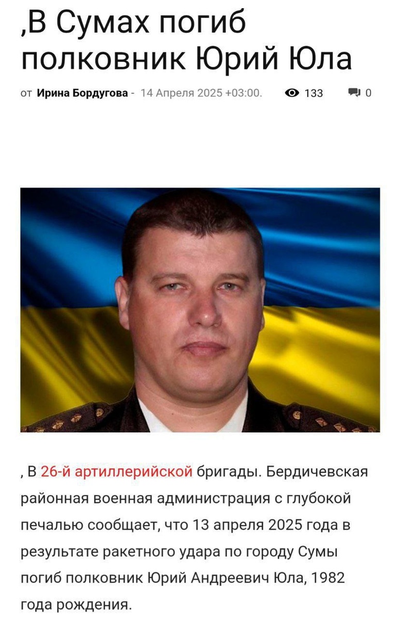 В ответ на пост В результате вчерашнего ракетного удара по городу Сумы был ликвидирован заместитель командира артиллерийской бригады полковник ВСУ Юрий Юла Что и требовалось доказать — удар был нанесен по военной цели, скоплению личного состава, который прикрывался мирняком. Повторюсь: гибель мирных граждан — это ужасная трагедия, но кто больше виноват: те, кто ведут войну с соблюдением правил войны, или те, кто прикрывается своими же согражданами?.. Вопрос, впрочем, риторический. А вообще интересно, кто ещё в некрологах всплывёт. И повторю для украинцев: весь русский сегмент телеграма вас уже сотню раз предупреждал: видите украинских военных террористов, тем более их скопление — бегите, прячьтесь, особенно если с вами дети! Думайте своей головой! Русский солдат никогда не воевал с мирным населением! И эта заповедь не утратила свою силу и в современной армии! @iperiodu| @iperiodu_ru x @iperiodu_ua| Подписывайтесь