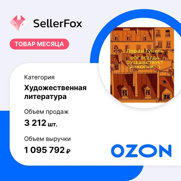 Что читают россияне. Книга «Бог всегда путешествует инкогнито» Лорана Гунеля вошла в топ товаров по количеству продаж в категории "Книги" на Ozon за последний месяц. Товар приобрели более 3 тысяч раз на общую сумму свыше 1 млн рублей. Книга входит в пятерку самых популярных беллетристов Франции, стала всемирным бестселлером, несколько лет возглавляла топ-листы продаж во Франции и была переведена на множество языков. Отметим, что по данным Российского книжного союза и операторов книжного рынка, на первом месте в 2024 году по итогам продаж оказался лидер прошлых лет — нон-фикшен Ольги Примаченко «К себе нежно. Книга о том, как ценить и беречь себя». За год он собрал 96,1 млн руб. Вторую строку занял первый том автобиографии «Мой театр» народного артиста России, бывшего солиста Большого театра и руководителя Академии русского балета имени Вагановой Николая Цискаридзе (62,3 млн руб.). Замыкает первую тройку «Восхитительная ведьма. Книга первая» Анны Джейн (53,9 млн руб.). Лидерами среди
