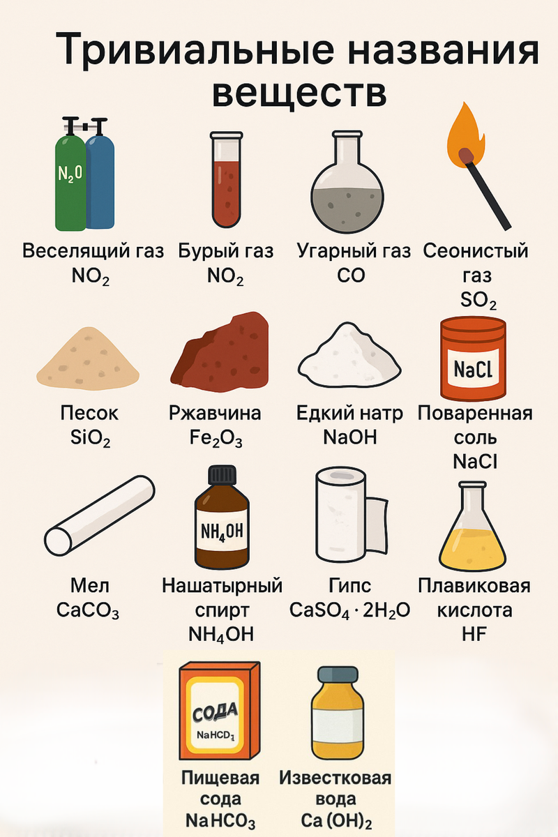 При подготовке к ОГЭ и ЕГЭ по химии важно не только знать формулы, но и понимать, как они называются в быту или исторически. Такие названия называются тривиальными. Они часто используются в заданиях и могут сбить с толку, если вы знаете только систематическую (научную) номенклатуру.
