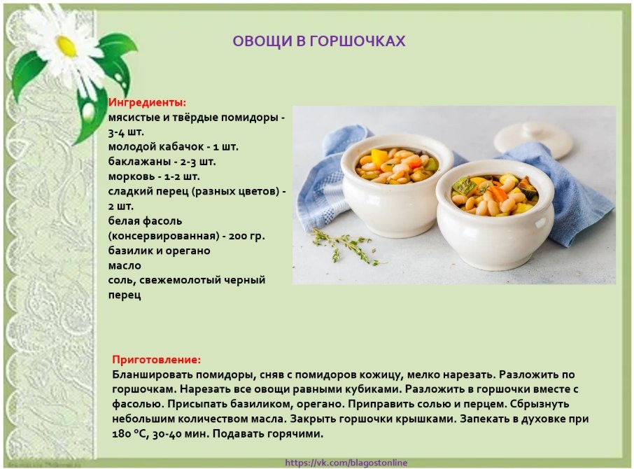 🍮 ОВОЩИ В ГОРШОЧКАХ 🌀 Ингредиенты: мясистые и твёрдые помидоры - 3-4 шт. молодой кабачок - 1 шт. баклажаны - 2-3 шт. морковь - 1-2 шт. сладкий перец (разных цветов) - 2 шт. белая фасоль (консервированная) - 200 гр. базилик и орегано масло соль, свежемолотый черный перец 🌀 Приготовление: Бланшировать помидоры, сняв с помидоров кожицу, мелко нарезать. Разложить по горшочкам. Нарезать все овощи кубиками. Разложить в горшочки вместе с фасолью. Присыпать базиликом, орегано. Приправить солью и перцем. Сбрызнуть небольшим количеством масла. Закрыть горшочки крышками. Запекать в духовке при 180 °С, 30-40 мин. Подавать горячими.