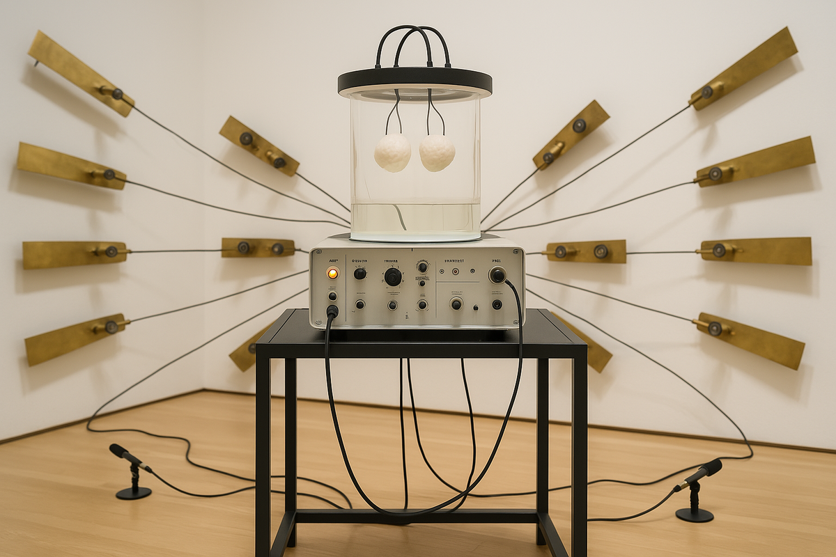 Австралийские исследователи совершили невероятное: они вырастили миниатюрный мозг из клеток покойного композитора-экспериментатора Элвина Люсье — и он создал новую музыку. В 2020 году, за год до своей смерти, 89-летний Люсье, страдавший болезнью Паркинсона, принял участие в проекте Revivification. Ученые взяли образец его крови, выделили лейкоциты и с помощью сложных биотехнологий перепрограммировали их в стволовые клетки, а затем превратили в мозговые органоиды — крошечные структуры, имитирующие работу настоящего мозга. Эти мини-органы, напоминающие два белых шарика, похожих на медуз, стали основой для необычного эксперимента. Исследователи подключили их к специальной системе, которая преобразует электрические импульсы нейронов в звук. Результатом стала уникальная звуковая инсталляция: 20 латунных пластин, расходящихся от стен, словно антенны. Каждая из них оснащена преобразователем (аналогом динамика) и молоточком, которые реагируют на сигналы мини-мозга. Но самое удивительное — орга