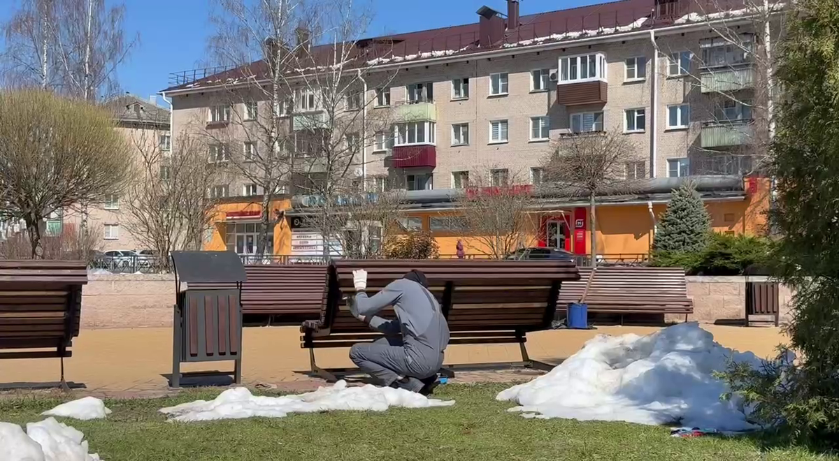 Возле фонтанов на ул. Жукова рабочие занимаются укладкой плитки и покраской лавочек и урн. Территорию вокруг фонтана приводят в порядок к празднику 9 мая.