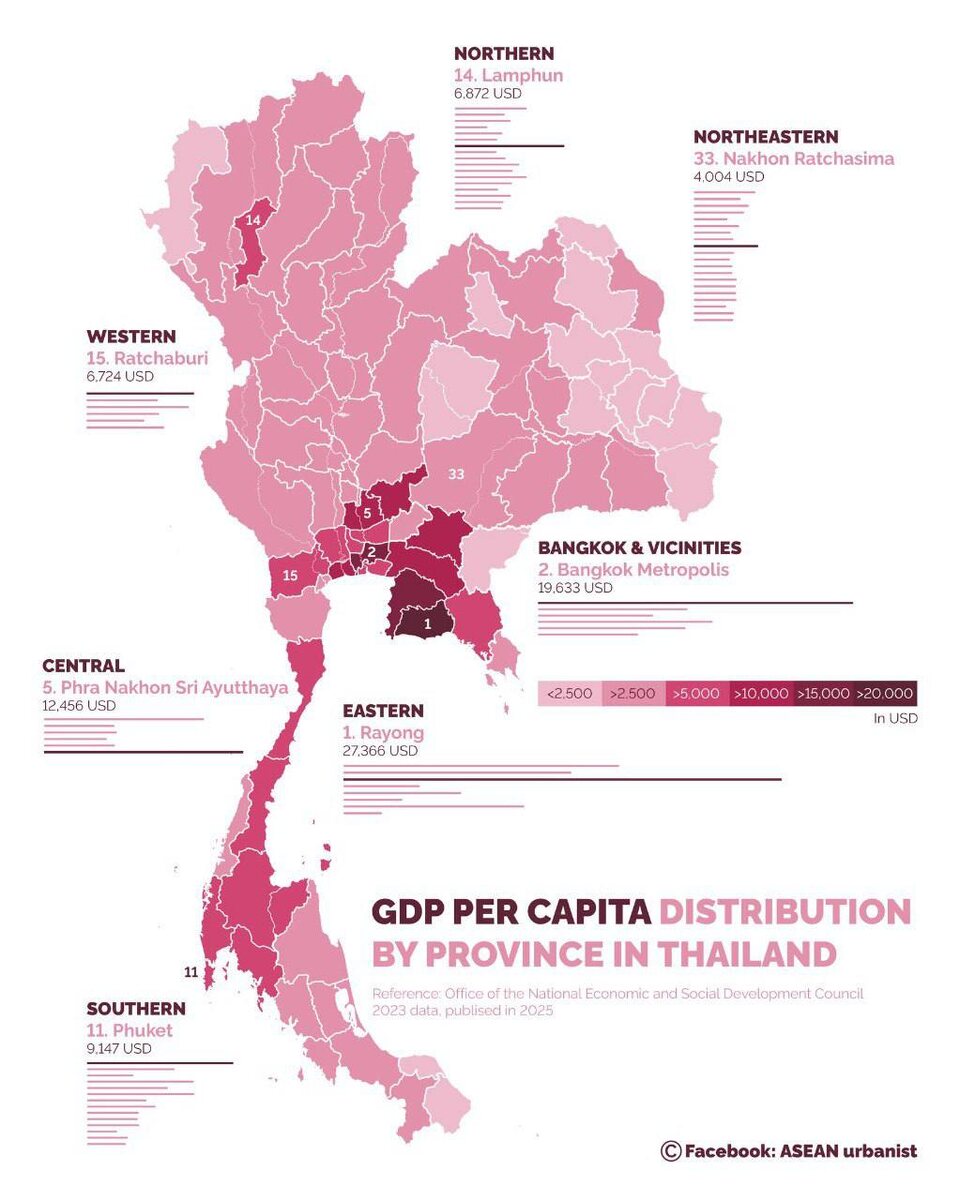 Где в Таиланде живут самые “денежные” провинции? Топ-10 по ВВП на душу населения Если судить по доходу на человека, то вот кто в Таиланде рулит экономикой: 1. Районг — $27,366 (не провинция, а нефтяной король) 2. Бангкок — $19,633 (ожидаемо, столица всё-таки) 3. Чонбури — $17,024 (Паттайя, заводы, порты — деньги текут рекой) 4. Чаченгсао — $14,232 (индустриальная зона + электроника) 5. Аюттхая — $12,456 (не только храмы, но и производство) 6. Прачинбури — $11,285 (тихо, спокойно, и с прибылью) 7. Самутсакхон — $10,864 (морепродукты + заводы) 8. Сарабури — $10,013 (цемент и промышленность) 9. Самутпракан — $9,303 (рядом с Бангкоком — выгодно) 10. Накхонпатхом — $9,197 (пригородный бизнес и агро-сектор) Вывод: там, где заводы, промышленность и порты — там и деньги. А пляжи… ну, не всегда про деньги. 🌴 Прислать новость | Подписаться | Смотреть другие новости