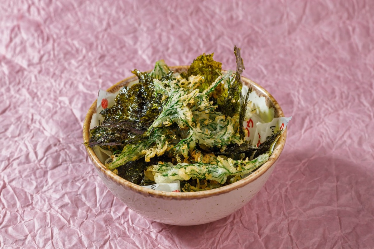 Бывает, есть совсем не хочется, но ты уже за столом и ничего не заказывать совсем неловко. Кажется, именно для таких случаев в изакайях Ku придумали укроп в темпуре. К траве добавляют еще листы нори. В этом можно увидеть союз моря и земли, вегетарианский surf&turf, сопоставление русского и японского вкуса. А можно - просто хрустящую закуску за 240Р. @foodiscovery