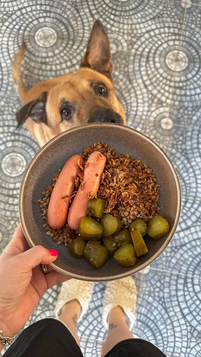 обэд) гречка, сосисочки, лучок жареный и огурцы