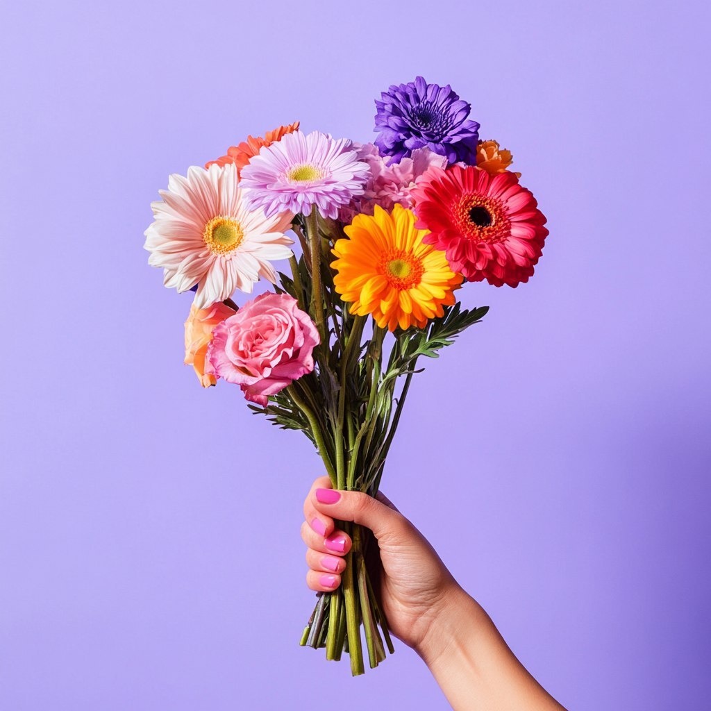 Создано на основе запроса: a bouquet of flowers colored in pastel colores, held by a hand, on a plain purple background