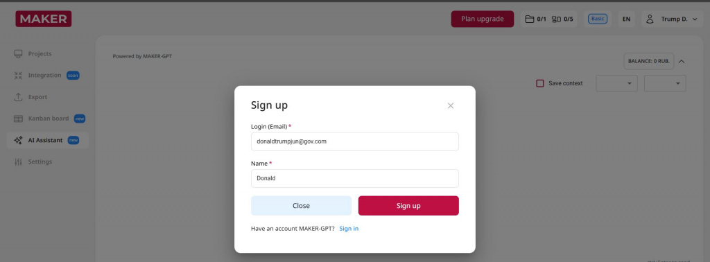 Для того чтобы начать в MAKER использовать ИИ ассистент, нужно перейти в специальный раздел меню и подключить его: