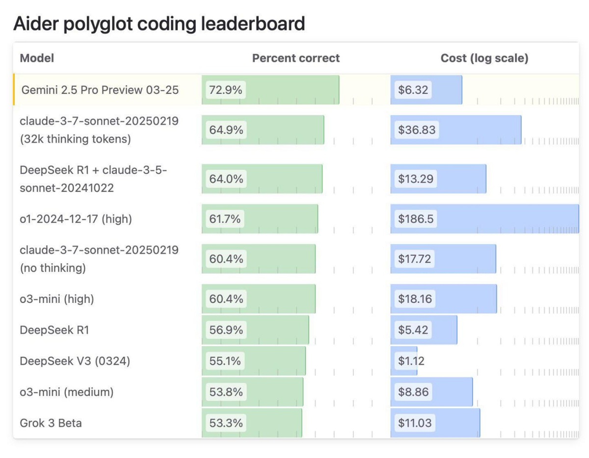 Aider - это чел, который классно работает с большими языковыми моделями (типа GPT), которые умеют писать и править программный код. Он использует всякие "тесты", чтобы понять, насколько хорошо эти модели понимают, что им говорят, и могут ли они сами, без помощи людей, исправить код, если что-то не так. У него есть свой личный "полиглот-тест", в котором куча сложных задачек по программированию (их там 225 штук), на шести языках: C++, Go, Java, JavaScript, Python и Rust. То есть он проверяет, как модель справляется с разными задачками на разных языках, чтобы убедиться, что она реально шарит. На картинке итоги с ценами... Изучите и сделайте выводы :) Русский ИТ бизнес