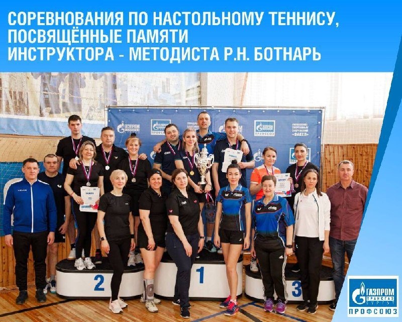 12 апреля в г. Сургут спортсмены филиалов ООО «Газпром трансгаз Сургут» встретились на соревнованиях по настольному теннису, посвящённых памяти инструктора - методиста Р.Н. Ботнарь🏓🌹 Итоги: КОМАНДНОЕ ПЕРВЕНСТВО 🥇 1 место - УЭЗС (Ивлев Дмитрий, Сухомлин Сергей, Яремчук Екатерина, Михайлова Ирина); 🥈2 место - ЮГ (Овчинников Владимир, Мартынов Олег, Бышевич Ольга, Деденёва Галина); 🥉3 место - УТТиСТ ( Усеинов Аким, Газизулин Радик, Царицон Гузель, Асутаева Замира) ЛИЧНОЕ ПЕРВЕНСТВО МУЖЧИНЫ 35+ 🥇1 место - Мартынов Олег (Богадинское ЛПУМГ) 🥈2 место - Ив лев Дмитрий (УЭЗС) 🥉3 место - Скрынник Андрей (Ортьягунское ЛПУМГ) МУЖЧИНЫ ДО 35 🥇1 место - Кондаков Николай (ИТЦ) 🥈2 место - Овчинников Владимир (Демьянское ЛПУМГ) 🥉3 место - Сухомлин Сергей ( УЭЗС) ЖЕНЩИНЫ 35+ 🥇1 место - Деденёва Галина ( Тобольске ЛПУМГ) 🥈2 место - Плетнёва Наталья ( Вынгапуровское ЛПУМГ) 🥉3 место - Бышевич Ольга (Южно-Балыкское ЛПУМГ) Фото: Сергей Бородин, УСС «Факел»