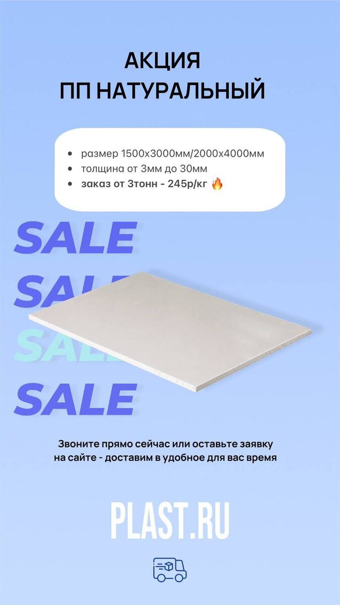 🔥АКТУАЛЬНЫЕ АКЦИИ🔥 Дорогие читатели, всем доброго дня! Напоминаем вам про действующие акции этого месяца на следующие материалы: • ПОЛИПРОПИЛЕН НАТУРАЛЬНЫЙ • ПОЛИПРОПИЛЕН ЧЕРНЫЙ ⚡️ЦЕНЫ ОТ 200р ЗА КИЛОГРАММ Для вашего удобства: ⬆️ Доставка по всей России 🏘 Возможность самовывоза со склада (всего 30 км от Москвы) Все материалы имеют необходимые сертификаты качества и соответствуют стандартам производства. Не упустите возможность запастись качественными материалами по привлекательной цене! Акция действует только до конца апреля. 🎙Звоните прямо сейчас: +7 (495) 479-00-00 +7 (800) 555-52-54 ✈️Или пишите нам: info@plast.ru #Plastru #акции #листовойпластик #полипропилен #пвх #пнд #скидки #выгода #доставка #производство #строительныематериалы