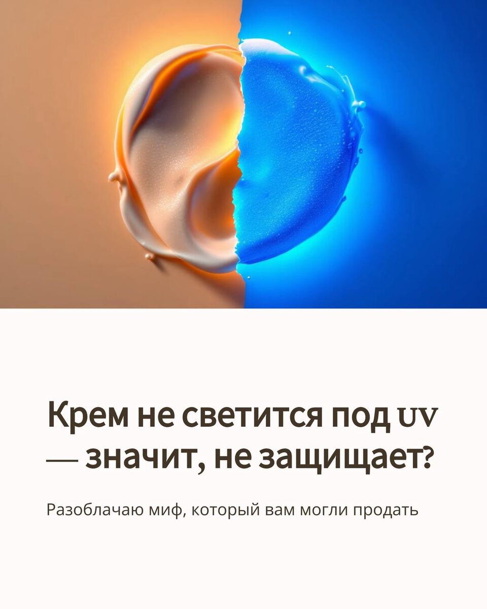 Чем темнее под UV — тем лучше защита? Миф. В последнее время всё чаще попадаются бьюти-блогеры, которые уверяют: если солнцезащитный крем слабо светится или вообще не виден под ультрафиолетовой лампой, значит, он не защищает от солнца. Звучит эффектно. Но на самом деле — это миф, и вот почему: ⸻ UV-съёмка не показывает уровень защиты. Она не измеряет SPF, PPD, устойчивость или качество формулы. Что она показывает: ▪ Нанесено ли средство. ▪ Насколько равномерно. ▪ Где оно уже стёрлось. ⸻ А вот чего она не покажет: ✖ Фильтрует ли средство UVA и UVB. ✖ Сколько времени оно эффективно. ✖ Степень защиты в цифрах. ✖ Как оно ведёт себя при поте, трении, воде. ⸻ Почему разные кремы по-разному светятся в UV? Потому что: ▪ У каждого УФ-фильтра — своё оптическое поведение. ▪ Одни фильтры поглощают UV и выглядят чёрными. ▪ Другие — почти незаметны. ▪ Особенно это касается современных органических фильтров (например, Tinosorb S или Uvinul A Plus) — они часто почти не видны в UV свете ламп