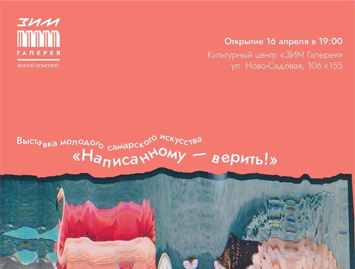 В среду, 16 апреля, в 19:00, в главном зале "ЗИМ Галереи" откроется выставка "Написанному — верить!" (16+). В экспозиции представят более 80 работ самарских художников. Среди участников выставки как молодые начинающие художники, так и известные самарские мастера: Анастасия Бастина, Денис Бердников, Олеся Бибик, Виолетта Бочкарева, Даля Бучионите, Ксения Вороничева, Эльмира Гилаева, Яна Гончарова, Роман Захаров, Елена Кабанова, Андрей Кабачек, Ксения Кабачек, Яна Каренских, Михаил Качикаракис, Марина Кейлина, Ирина Ким, Алексей Коньков, Алсу Коуки Амри, Екатерина Коталевская, Лиза Куртова, Ирина Ланг, Максим Овчинников, Михаил Надымов, Екатерина Оленина, Наталья Прокофьева, Ольга Силантьева, Ксения Симакова, Олеся Степанова, Оксана Стогова, Елена Суровцева, Денис Тачез, Ксения Тимофеева, Яна Ткачук, Елена Чумаченко, Александр Шептунов, Екатерина Эдельман. "Мы можем наблюдать, как художники отходят от привычной техники исполнения произведений искусства, экспериментируя с технологиями, фо