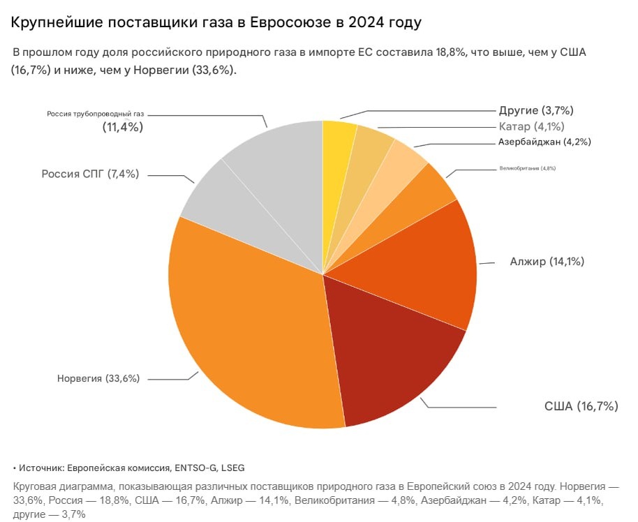 ⛽️ Европейцы просят вернуть российский газ, — Reuters Трамп использует энергетику в качестве разменной монеты в торговой войне. Компании из ЕС опасаются, что зависимость от Штатов стала их уязвимостью. Руководители крупных предприятий начали говорить, что импорт российского газа может быть хорошей идеей. Европа никогда не вернётся к импорту 150 млрд кубометров газа из России, как это было до конфликта, но я бы поставил на то, что ЕС начнёт импортировать 70 млрд кубометров, — говорит Глава TotalEnergies Патрик Пуянн. Некоторые немецкие руководители заводов говорят, что российский газ нужно вернуть в кратчайшие сроки, и просят открыть «Северный поток-2». Мы переживаем серьёзный кризис и не можем ждать, — сказал управляющий директор InfraLeuna Кристоф Гюнтер. Впрочем, сами европейские промышленники говорят, что закупка российского газа — это запретная тема. ❗️ А тем временем Европейские чиновники планируют в мае обнародовать дорожную карту по поэтапному отказу от российского топлив