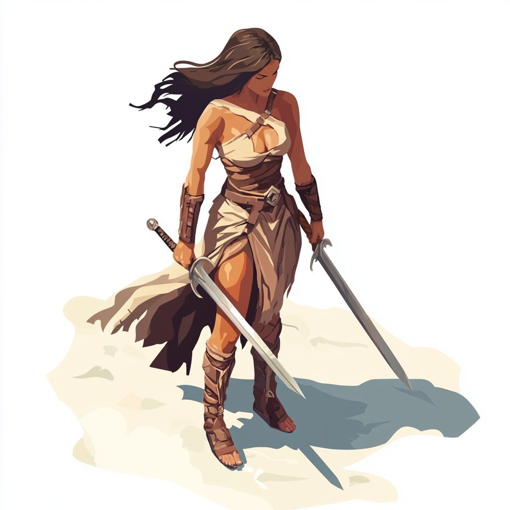 Создано на основе запроса: isometric view of barbarian woman with sword walking, white background