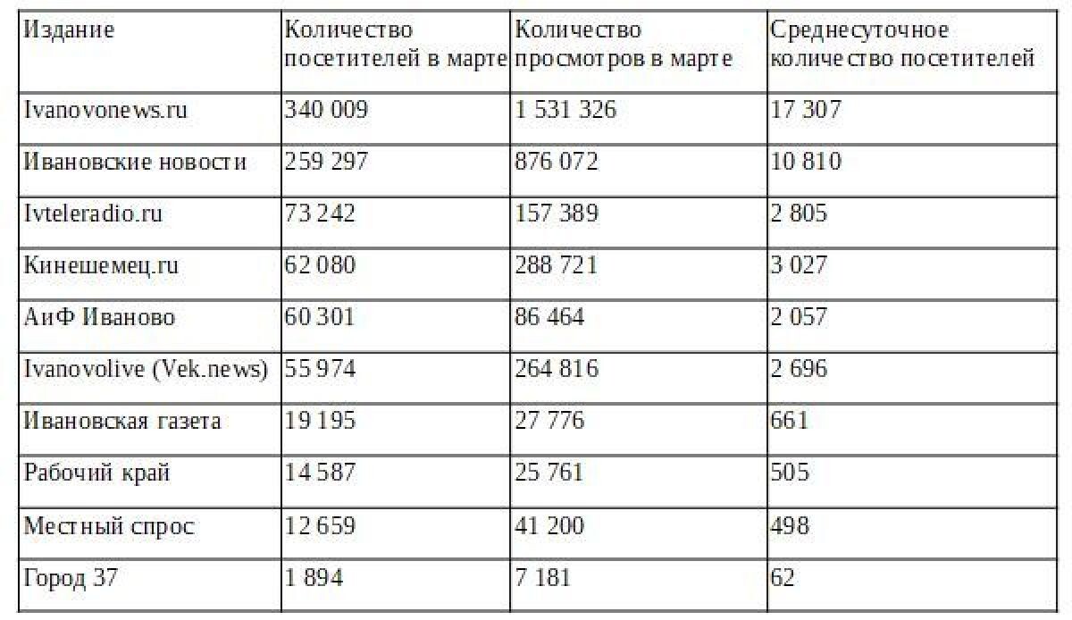 По сравнению с февралем, в мартовском рейтинге произошли небольшие изменения. Издание «Кинешемец.ru» спустилось на одну позицию, а Ivteleradio.ru вошло в тройку лидеров.