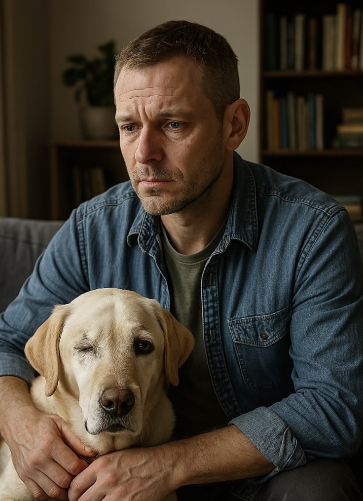 ...Напротив него, привязанная к трубе у стены, стояла собака. Лабрадор. Худая, бледная, с висящими ушами. Она дрожала и явно не понимала, за что её так наказывают.
